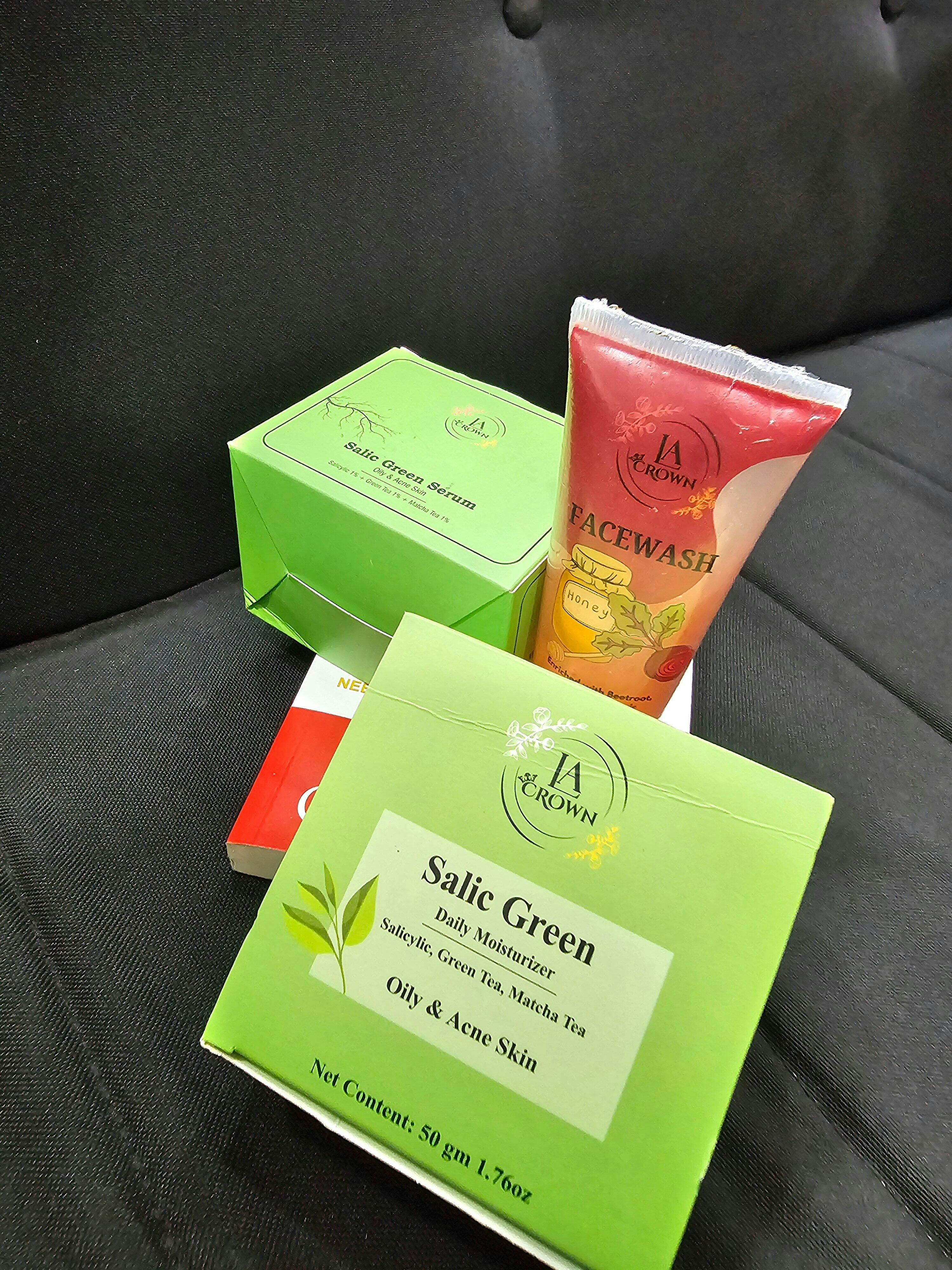 A complete 3-step skincare routine designed to brighten, clear, and balance your skin. This bundle pairs the Mulberry Facewash for deep hydration and glow, the Salic Green Serum for acne control and pore cleansing, and the Salic Green Moisturizer for lightweight, non-greasy hydration. Together, they target dullness, uneven tone, breakouts, excess oil, and rough texture—leaving your skin visibly clearer, smoother, and naturally radiant.